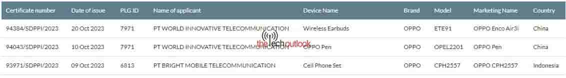 This is because our team at The Tech Outlook recently spotted Oppo Enco Air 3i on the SDPPI certification website with model number ETE91.