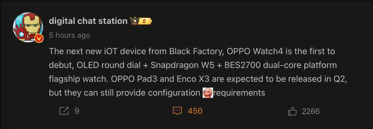Oppo Watch 4 tipped to arrive with Snapdragon W5+ BES2700 SoC; Oppo Pad 3 and Oppo Enco X3 launch timeline tipped
