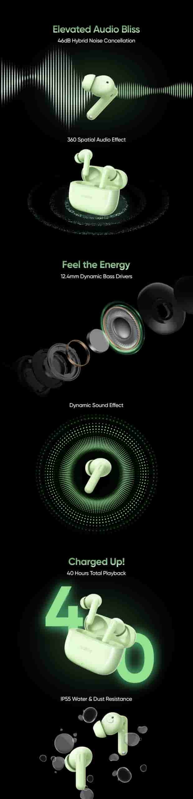 The Realme Buds N1 is equipped with 12.4mm dynamic bass drivers, designed to deliver clear sound quality. They feature 46dB hybrid noise cancellation to minimise external noise during audio playback. Additionally, the Buds N1 offers 360° spatial audio for an immersive surround sound experience and provides up to 40 hours of playback time on a single charge. The earbuds also have an IP55 rating, ensuring resistance to sweat, dust, and water splashes.