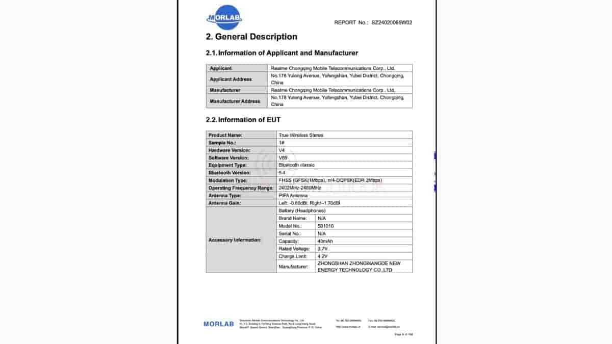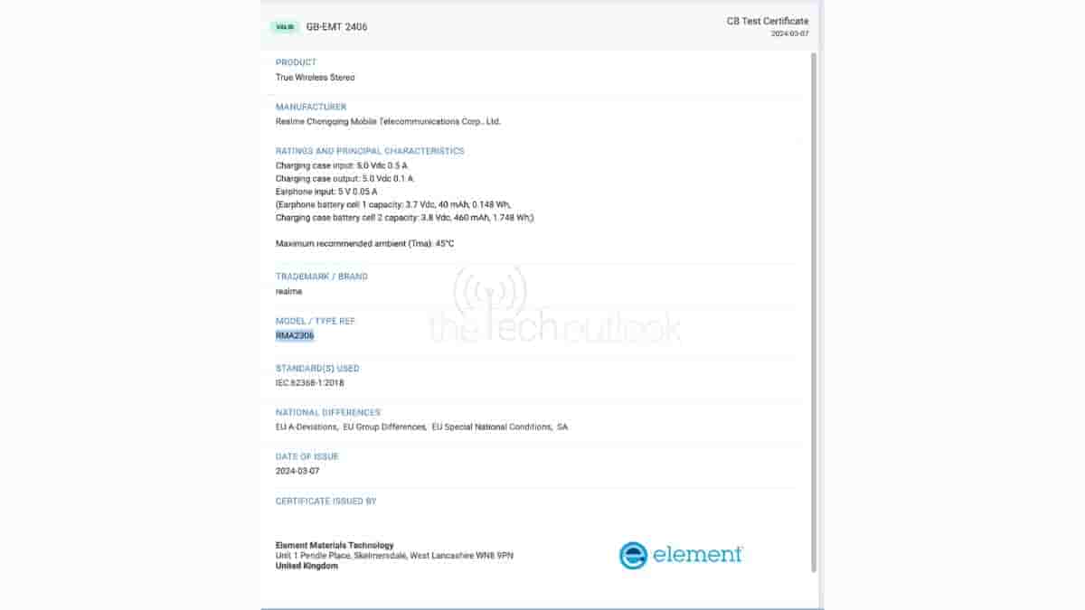 On the Element certification platform, it has been certified with the certificate number of “GB-EMT 2406”, and bearing the same model number of “RMA2306”, it has been listed under the true wireless stereo devices category. To add, the 40 mAh and 460 mAh battery capacities of the earbuds and charging case have also been mentioned here as well.