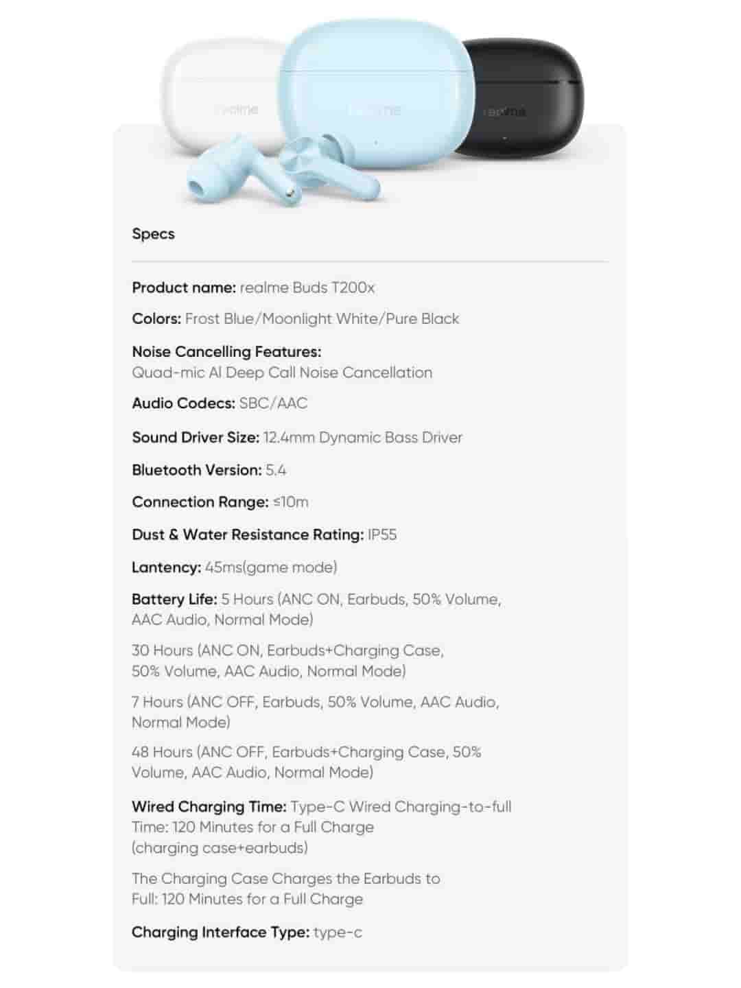 About its key specs, it is revealed to feature a 12.4mm dynamic bass driver within each of the earbuds and a quad-mic system supporting AI deep call noise cancellation (+ 25dB active noise cancellation). SBC and AAC audio codecs as well as Bluetooth connectivity version 0f 5.4 are also supported, with a connectivity range of ≤10m. Additionally, 45ms ultra-low latency and dual-device connection are other notable specs.