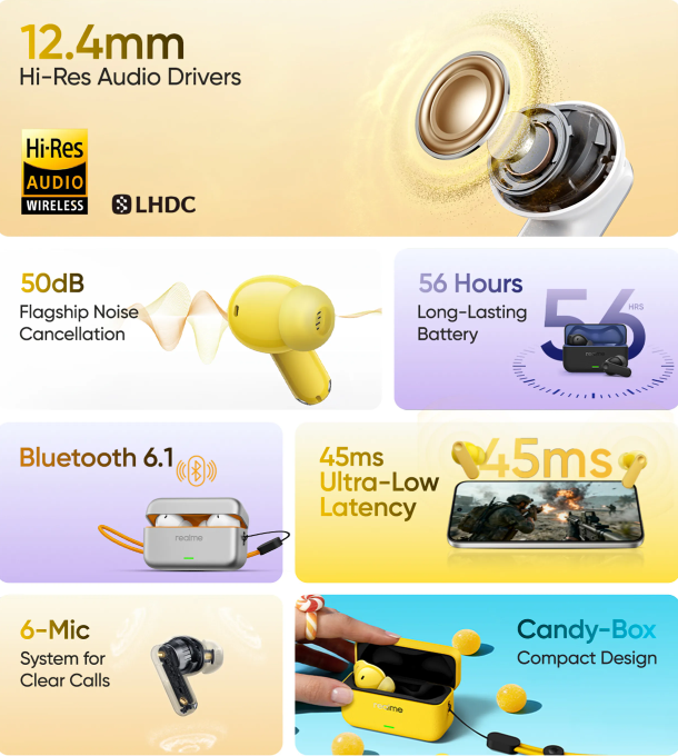 As per what has been revealed via the microsite, the earbuds will feature 12.4mm Hi-Res Audio drivers with a titanium-coated diaphragm, and it will support LHDC 5.0, SBC, and AAC audio codecs. It will also be supporting AI-powered adaptive active noise cancellation of up to 50dB depth, along with an ultra-wide 5000Hz noise cancellation bandwidth. Realme also claims that the device is capable of reducing voice noise by up to 100%, and offers up to 66% deeper noise cancellation when compared to the Realme Buds T310.
