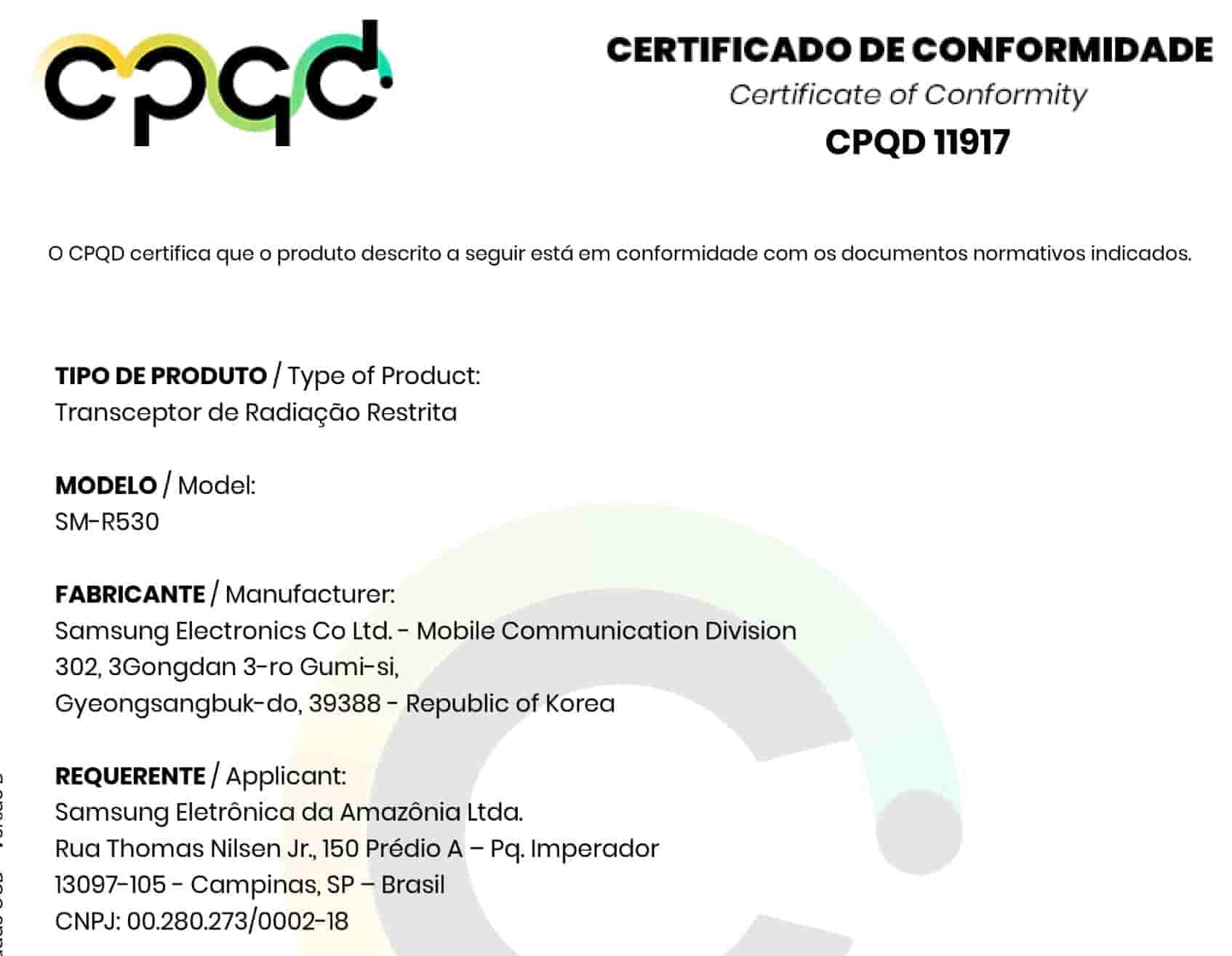 Now, once again, the vanilla variant has been spotted on a Brazilian certification website called ANATEL. It is listed with the same model number, “SM-R530”, however, the moniker is not present. Apart from this, the certification doesn’t reveal anything about the hardware or software specs. However, it hints that it will be launched in the Brazilian market as well.
