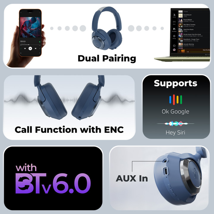There are 3 EQ modes: Equaliser mode, Sound Monster mode and Vocal Enhancer mode. It supports dual pairing, Ok Google, Hey Siri, Bluetooth 6.0 connectivity and calling function with ENC. It features a foldable design, and there is an AUX IN port for wired connection. The headset sports a soft and comfortable ear cushion.