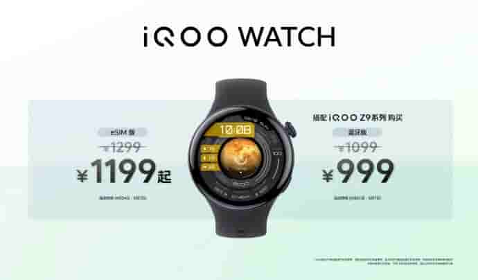 From April 24th to May 7th, users can get the iQOO Watch eSIM version for 1199 Yuan. If users purchase the Bluetooth version from April 24th to May 7th along with an iQOO Z9 series device, they can get it for 999 Yuan.