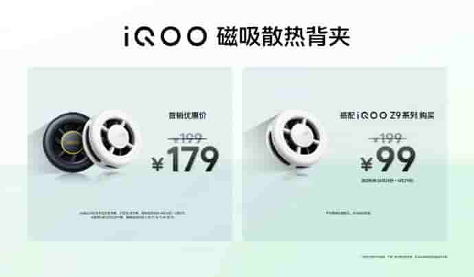 First sale discount price of iQOO Magnetic Cooling Back Clip is 179 Yuan. If the users purchase this device along with the iQOO Z9 series smartphone from April 24th-April 29th, they can get this device for 99 Yuan.