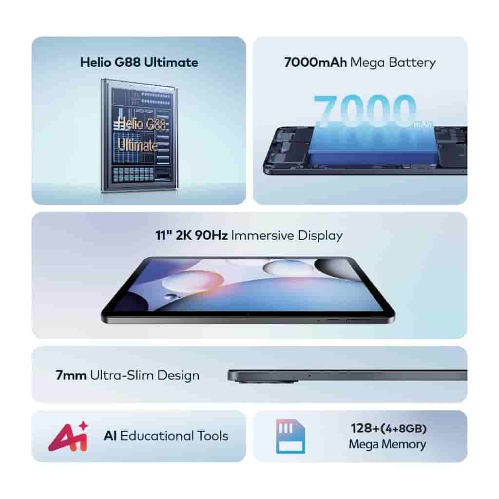 itel’s VistaTab 30S tablet will be powered by the MediaTek Helio G88 Ultimate chipset, and it will be coupled with 4GB+8GB of RAM and 128GB of internal storage. An 11″ display screen supporting 2K resolution and 90Hz refresh rate is also part of the device. It also packs a 7000 mAh battery backup, and features an ultra slim form factor design with 7mm thickness. Additionally, AI educational tools are also equipped within it. The brand has also announced free keyboard and BudsAir 5i earbuds for the latest VistaTab 30S, along with an additional voucher.