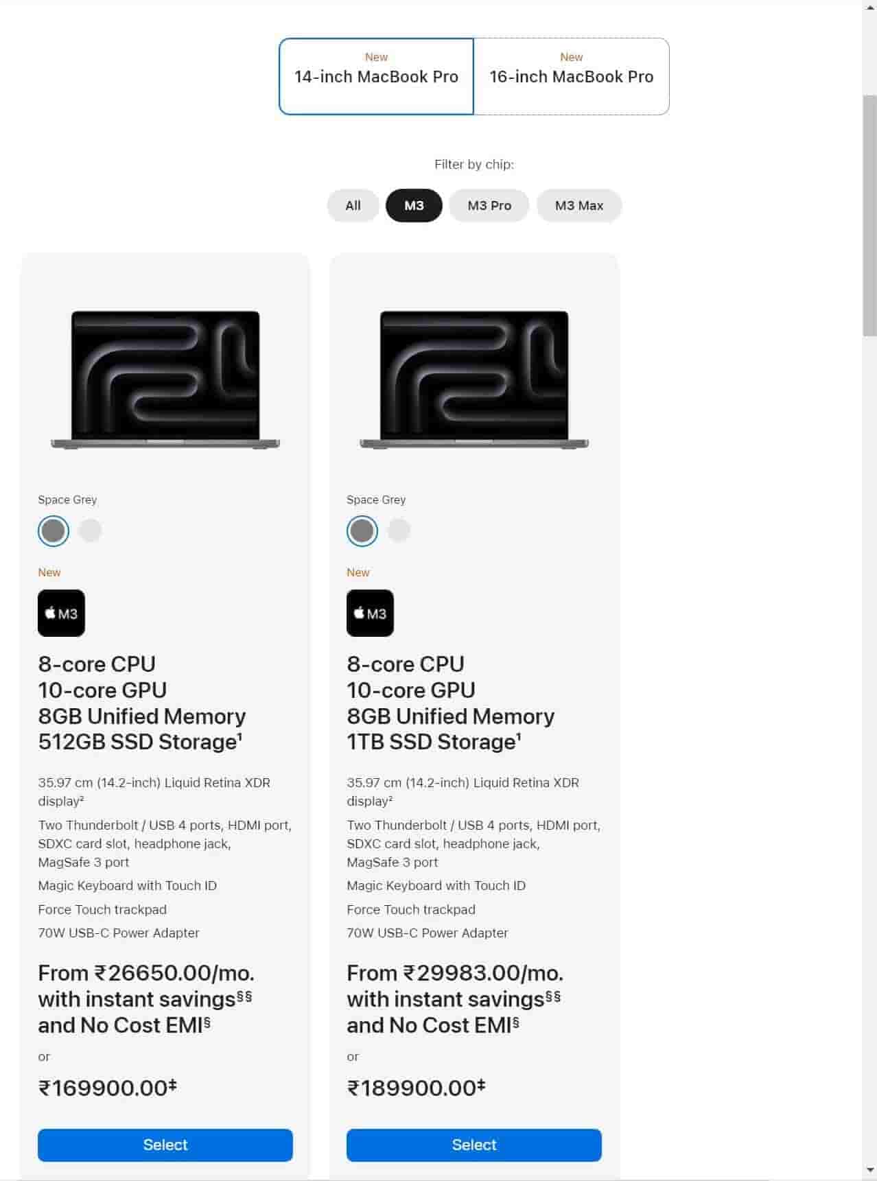Now about their price in India, the model with the M3 chip comes only with a 14″ display screen size, with the price of Rs. 1,69,900 for the 8GB/512GB storage option, and Rs. 1,89,900 for the 8GB/1TB storage option.