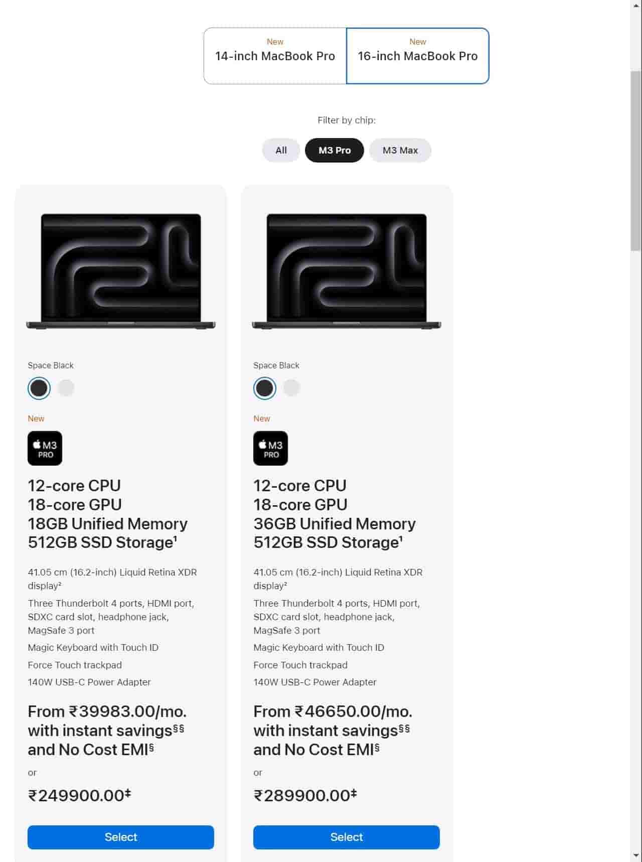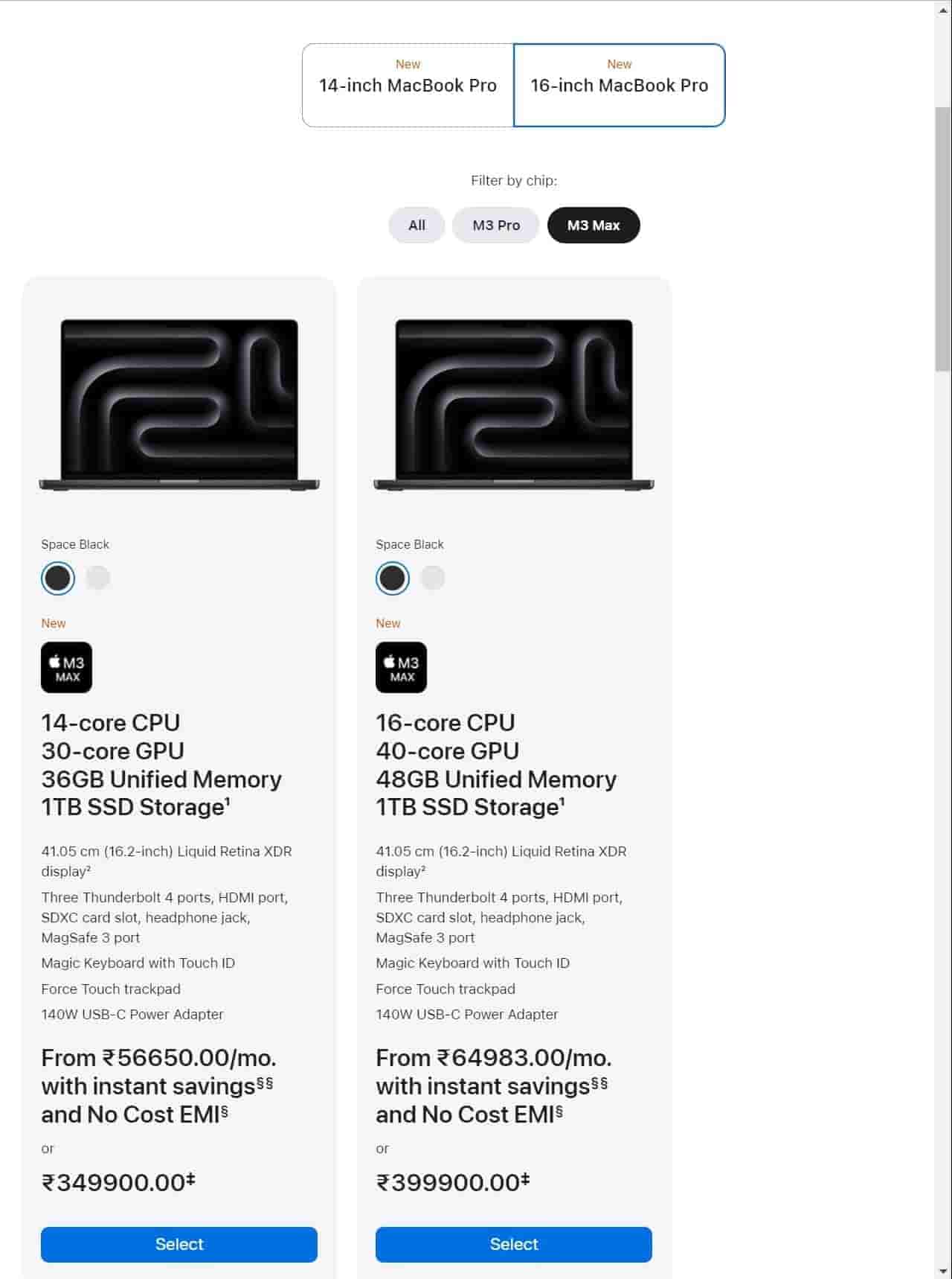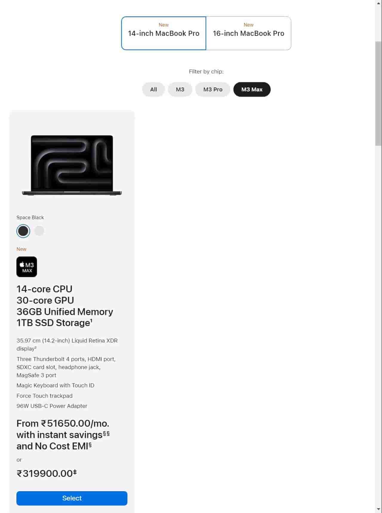 The M3 Max model has 14″ and 16″ display screen sizes. The M3 Pro 14″ variant only has a 36GB/1TB storage option and is priced at Rs. 3,19,900. The M3 Pro 16″ variant has two storage options – 36GB/1TB and 48GB/1TB, with price tags of Rs. 3,49,900 and Rs. 3,99,900, respectively.
