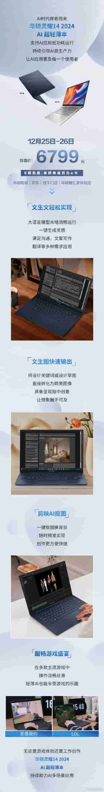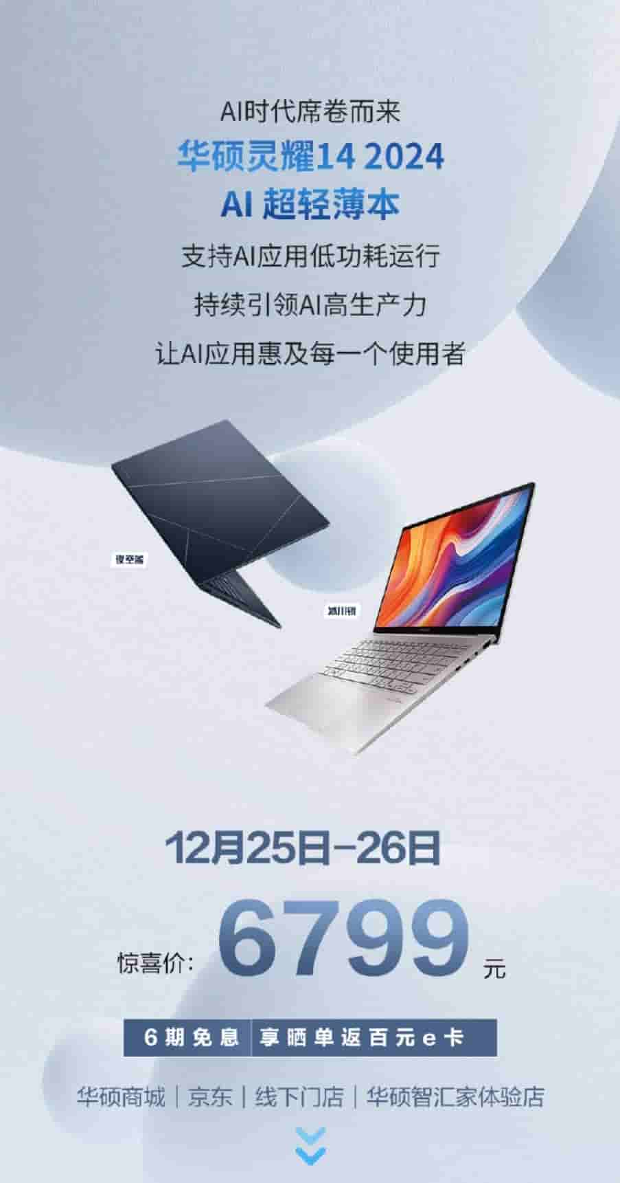 ASUS had put up its ZenBook 14 2024 notebook for sale on ASUS Mall, JD.com, ASUS experience stores, and other offline stores for a surprise price of CNY 6,799 on the 25th and 26th of December 2023. Along with this exciting discount price, benefits like 6 interest-free periods and CNY 100 worth of rebate cards were also offered to customers.