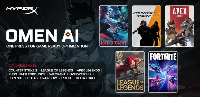 Another feature mentioned is OMEN AI, a one-press game optimisation tool that adjusts performance settings for supported titles. The games listed on the microsite include Counter-Strike 2, League of Legends, Apex Legends, PUBG: Battlegrounds, Valorant, Overwatch 2, Fortnite, Dota 2, Rainbow Six Siege, and Delta Force.