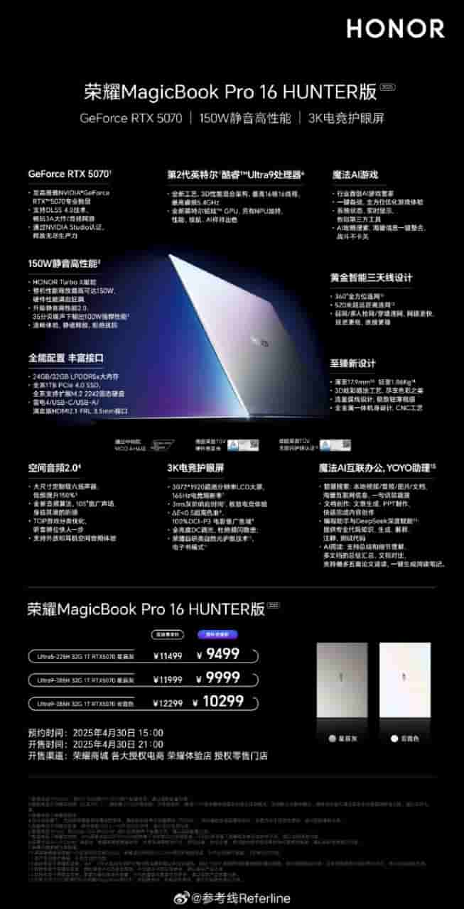 On the other hand, the Magic Book Pro 16 Hunter Edition 2025 laptop offers ‘Ultra5-225H 32GB/1TB RTX5070 Star Grey’, ‘Ultra9-285H 32GB/1TB RTX5070 Star Grey’, and ‘Ultra9-285H 32GB/1TB RTX5070 Cloud’ variants. They carry discounted price tags of CNY 9499 (actual price – CNY 11499), CNY 9999 (actual price – CNY 11999), and CNY 10299 (actual price – CNY 12299) respectively. Its pre-booking is currently live and its official sale is scheduled to begin from today itself, on the 30th of April 2025, at 9:00 PM local time in China.