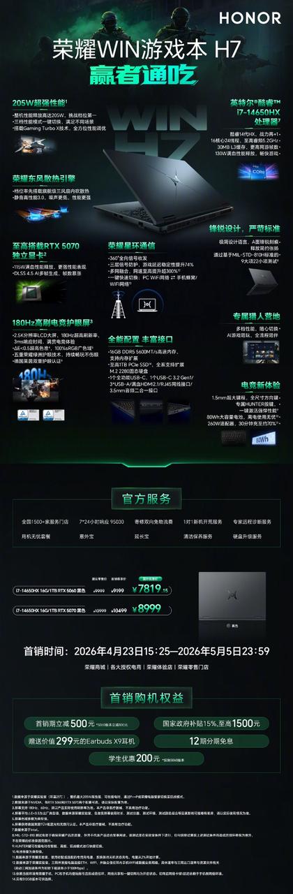Regarding its pricing and availability, the Honor WIN Gaming Laptop H7 models with the Intel Core i7-14650HX processor, 16GB RAM, and 1TB storage are priced at CNY 7819 for the RTX 5060 variant and CNY 8999 for the RTX 5070 variant (discounted prices from CNY 9999 and CNY 10999 respectively). The first sale period for these models is scheduled from April 23rd, 2026 (15:25) to May 5th, 2026 (23:59).