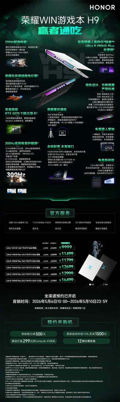 Speaking more, the Honor WIN Gaming Laptop H9 models are offered in multiple configurations. The Ultra 7 255HX + RTX 5060 variant is priced at CNY 9999 (from CNY 11999), while the Ultra 9 290HX Plus + RTX 5060 variants are priced at CNY 11499 and CNY 11799. The RTX 5070 model is priced at CNY 12699, and the RTX 5070 Ti variants are priced at CNY 12999 and CNY 16499 for the 16GB and 32GB RAM options respectively (discounted from higher original prices). Pre-orders for these models are currently live, and their first sale period is scheduled from May 6th, 2026 (10:00) to May 10th, 2026 (23:59).