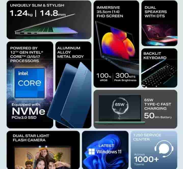 The laptop arrives with an aluminum alloy metal body, it measures 14.8mm and weighs 1.24kg. It features a 14-inch FHD display that offers 100% sRGB coverage along with 300 nits brightness. It is powered by 12th Gen Intel Core i3/i5/i7 processors and is equipped with NVMe PCIe 3.0 SSD.