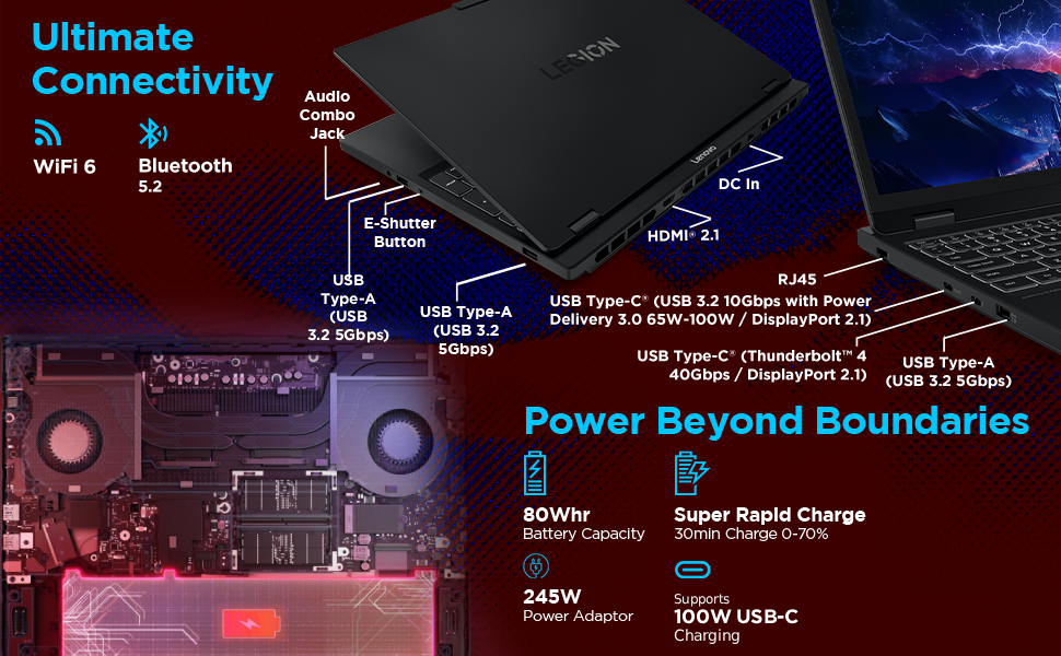 Other key specs include the boosted FPS, MUX switch, Lenovo AI Now, HD 720p camera with E-shutter, Nahimic Audio, Harman tuned stereo speakers (2W x 2), WiFi 6, Bluetooth 5.2, and Windows 11 Home operating system. An 80Whr battery is packed within the device, and it comes with a 245W charging adapter. The rapid charge feature offers up to 70% charge in just 30 minutes, and it also supports a 100W USB-C charging capability.
