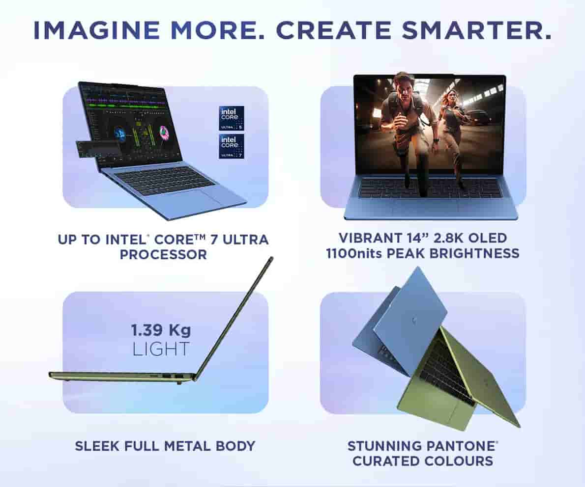 The laptop features a 14-inch 2.8K OLED display with a 120Hz refresh rate, 100% DCI-P3 colour coverage, and up to 1100 nits peak brightness.