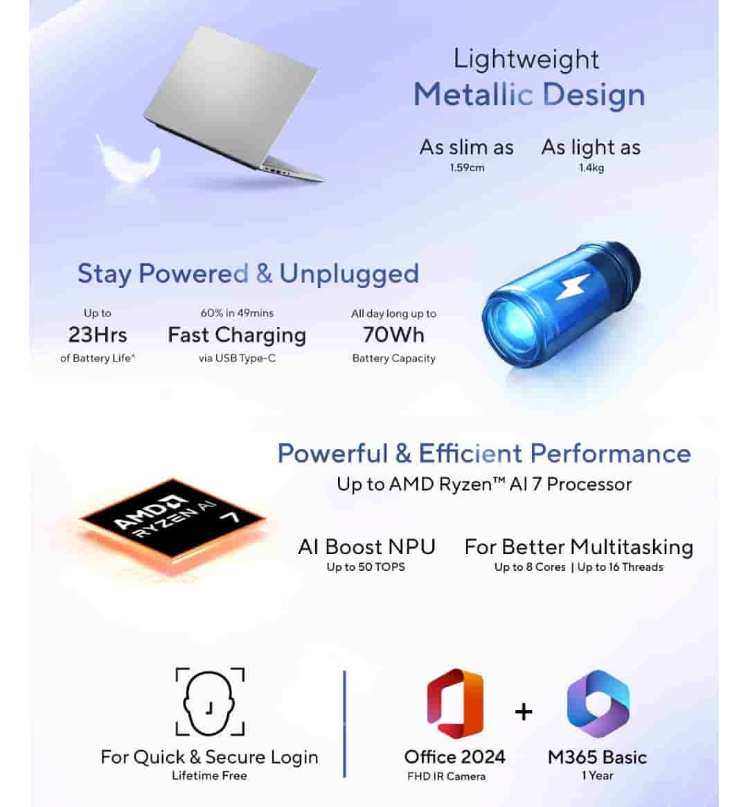 They are revealed to be Copilot+PC and will feature a metallic design with a 1.4kg weight and a 1.59cm slim profile. They will be powered by a 70Wh battery capacity and, with the help of fast charging technology, can be charged up to 60% in 49 minutes. They offer up to 23 hours of battery life. They are powered by up to an AMD Ryzen AI 7 processor (up to 8 cores & up to 16 threads) paired with an AI Boost NPU up to 50 TOPS.