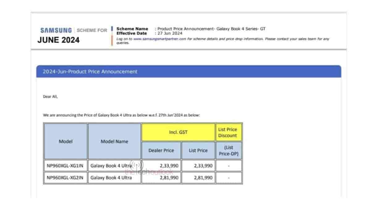 We have an exclusive image showing the pricing details of the Galaxy Book 4 Ultra in the Indian offline market. The model numbers listed are NP960XGL-XG1IN and NP960XGL-XG2IN. In the screenshot below, you can see the list price and dealer price: Rs 2,33,990 for the XG1IN and Rs 2,81,990 for the XG2IN.