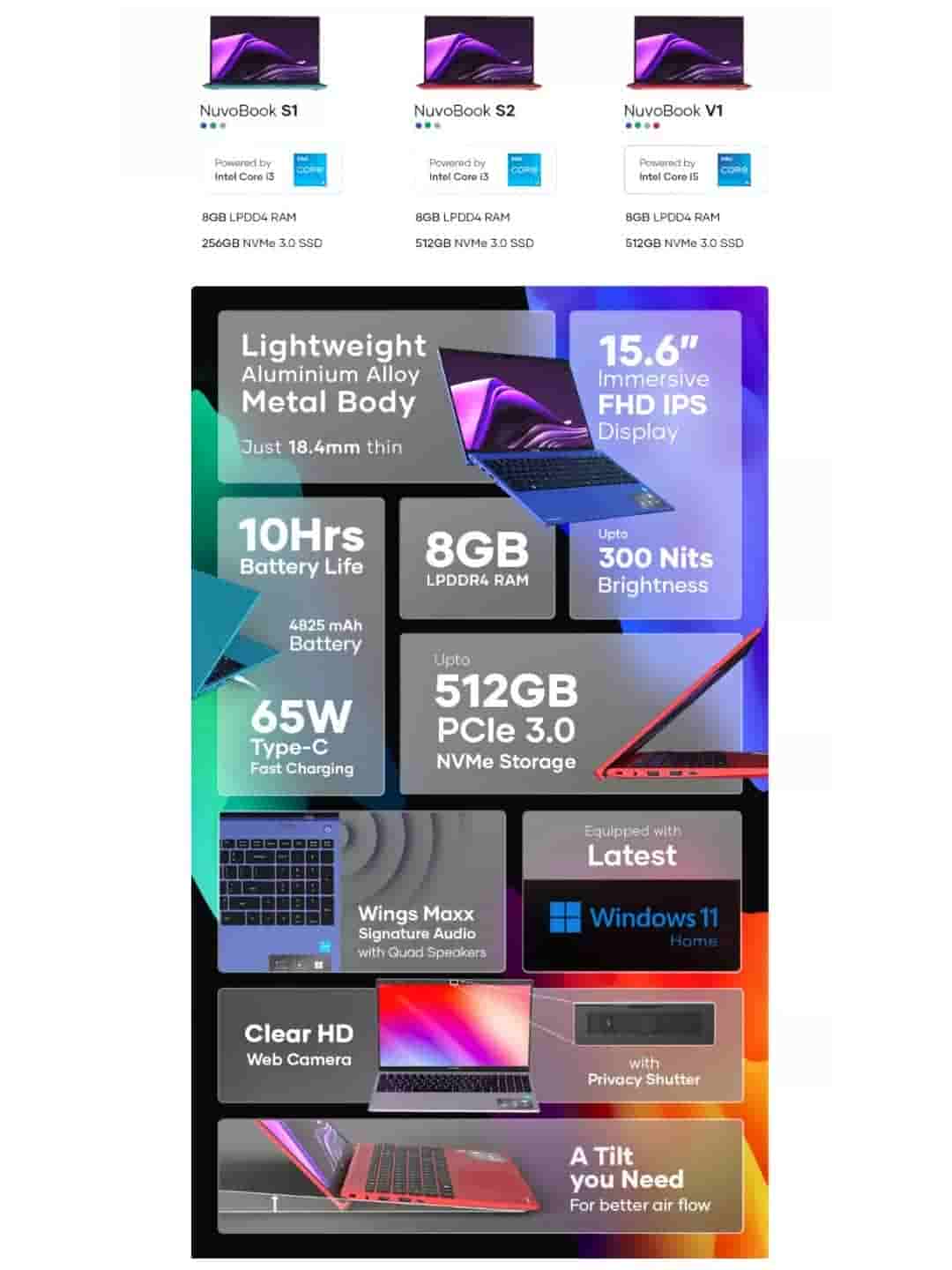 The Nuvobook S1, S2 and V1 laptops feature a lightweight aluminium alloy metal body and weigh 1.6Kg with a thickness of 18.4mm. The S1 and S2 laptops are powered by the Intel Core i3 processors, whereas the V1 has a better Intel Core i5 processor. The three devices will be coupled with an LPDD4 RAM of 8GB and with up to 512GB of NVMe 3.0 SSD. All the laptops run on the Windows 11 Home operating system.