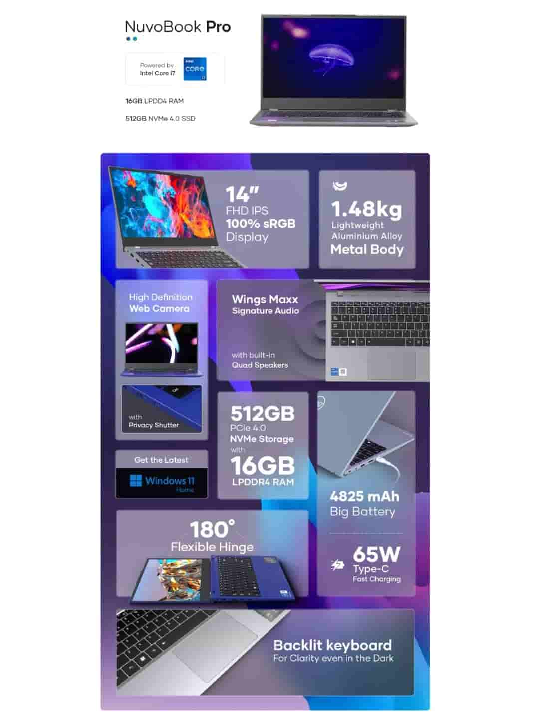 Now, coming to the Nuvobook Pro laptop, the device has an even lightweight aluminium alloy metal body with only a weight of 1.48 kg. The device is also powered by the Intel Core i7 processor and has a 16GB LPDD4 RAM and a 512GB NVMe 4.0 SSD to offer its users. It will also be running on the latest Windows 11 Home operating system as well.