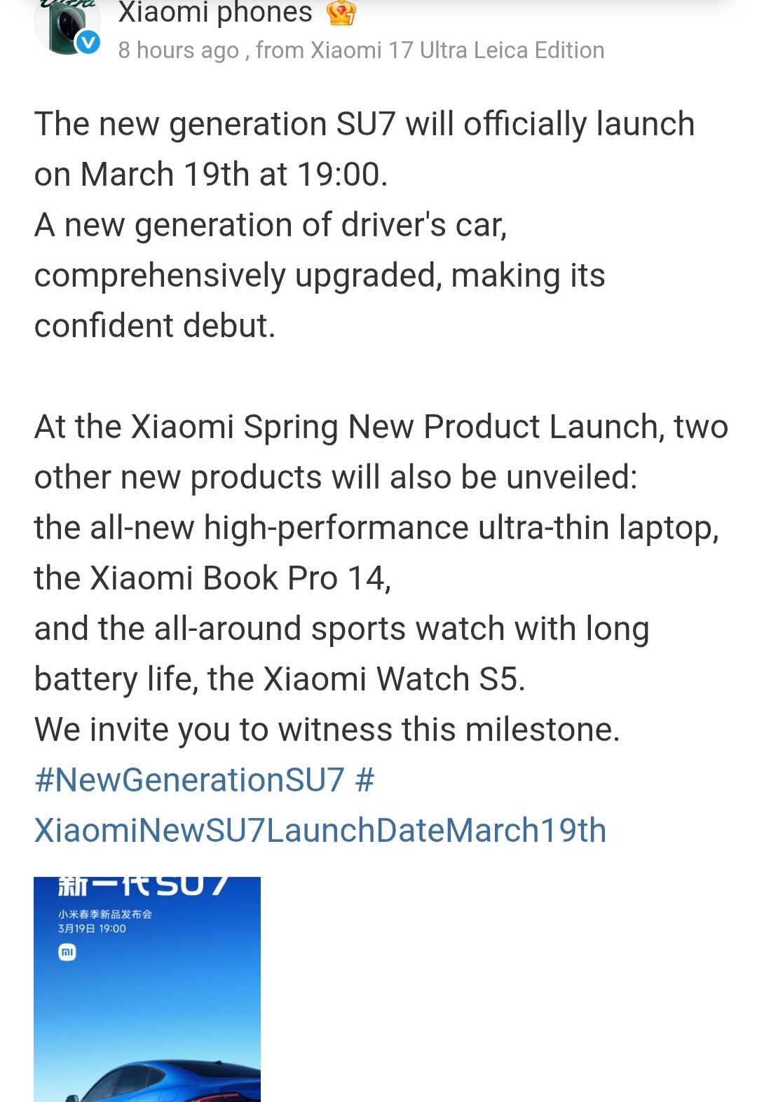 Today, Xiaomi has officially announced that it will be officially unveiling the Xiaomi Book Pro 14, Xiaomi Watch S5 and the new generation Xiaomi SU7 on 19th March at 19:00 (local time in China) during the Xiaomi Spring New Product Launch event.