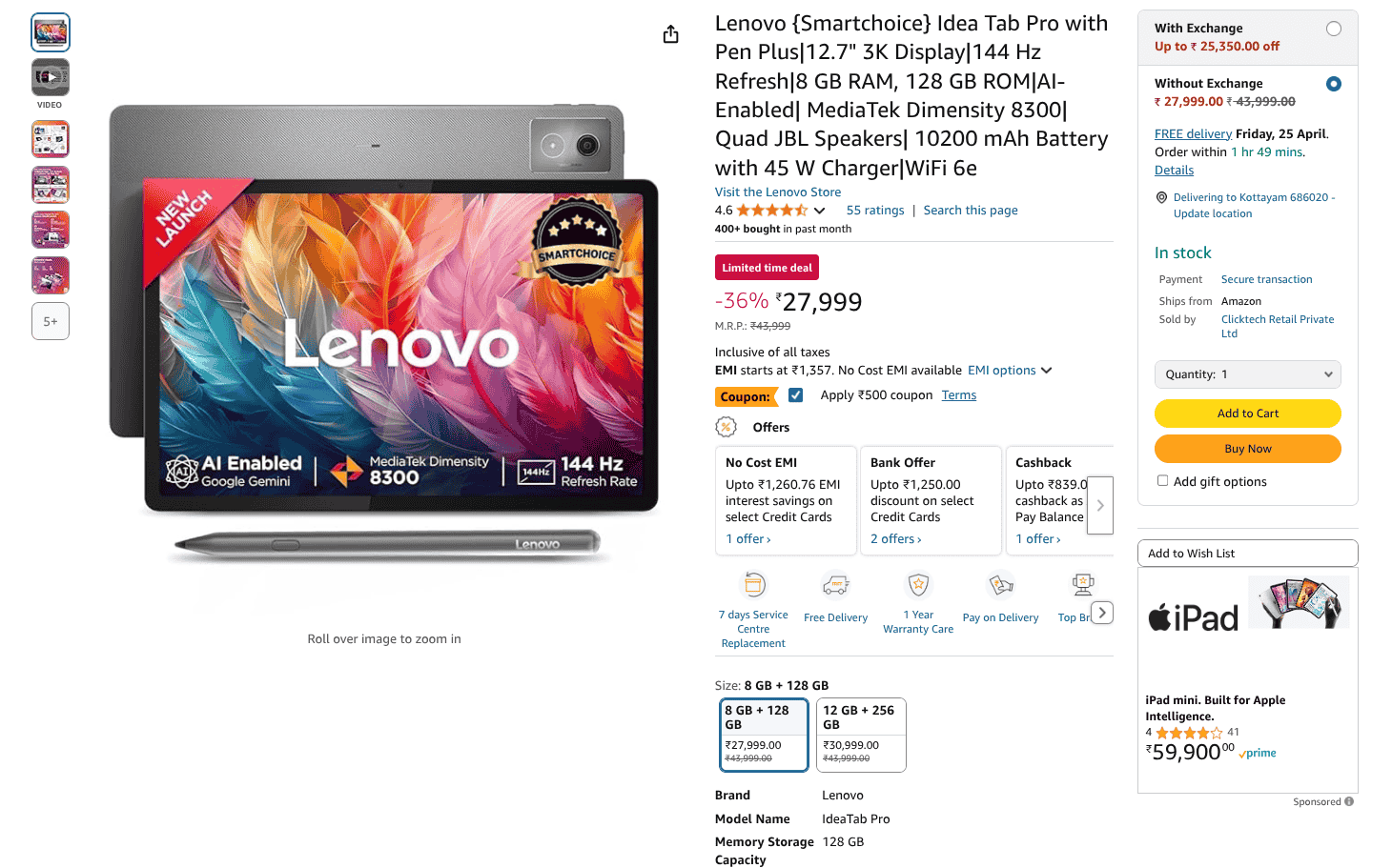 The Lenovo Idea Tab Pro (with Pen Plus) comes in 8GB/128GB and 8GB/256GB storage options, and they are priced respectively at INR 27,999 (36% discount from actual list price) and INR 30,999 (30% discount from actual list price). Indian customers will only be able to get it one color choice – Luna Grey. Apart from the discounted price, no cost EMI, cashback, coupon discount, bank offers, and partner offers are also other benefits available with the tablet on Amazon.