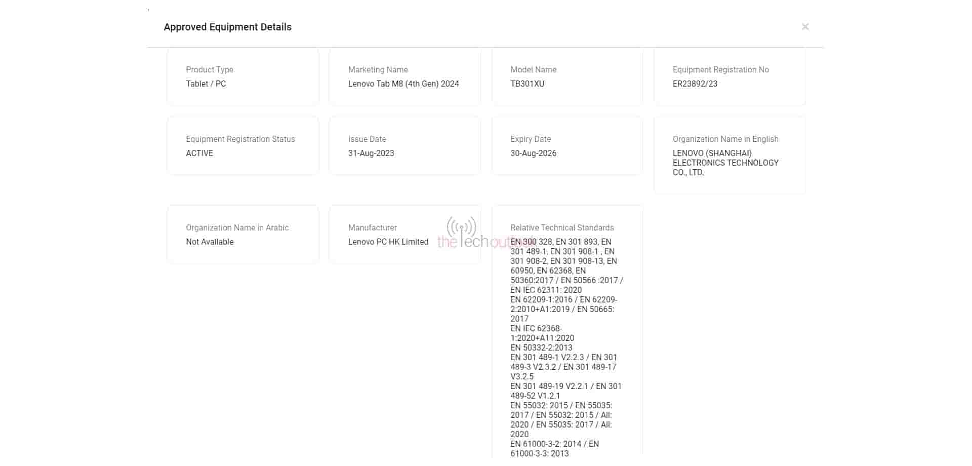 This is because The Tech Outlook has now spotted a new variant of Lenovo Tab M8 4th Gen 2024 on the TDRA certification website with model number TB301XU.
