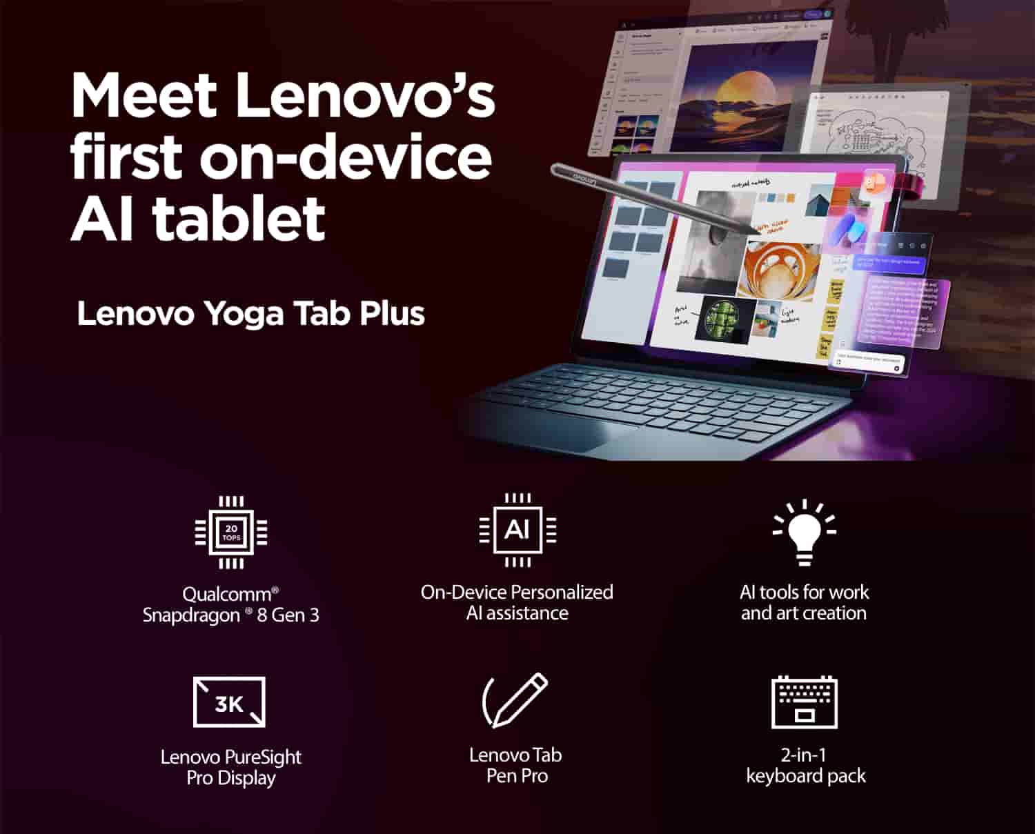 The Lenovo Yoga Tab Plus device is powered by Qualcomm’s Snapdragon 8 Gen 3 chipset, and notably it offers its users on-device personalized AI assistance. It features the Lenovo PureSight Pro display, and supports the Lenovo Tab Pen Pro and a 2-in-1 keyboard pack as well. AI tools have also been equipped within the device, offering art and work related creative capabilities.