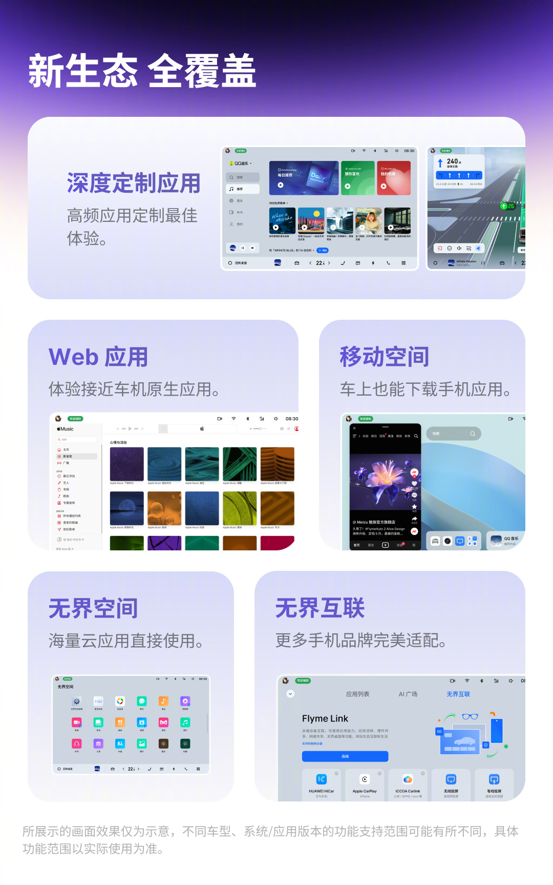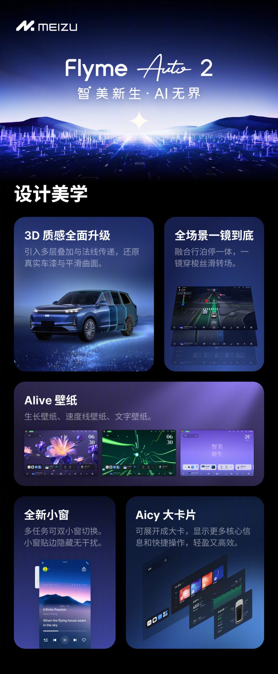 Regarding Flyme Auto 2, a fully-upgraded 3D texture, one-shot entire scene, Alive wallpapers, new small windows, Aicy big card, new AI vision system, AI mind reading, AI square, deeply customized applications, web application, moving space, unbounded cloud space, unbounded connectivity, and child care are its notable features.