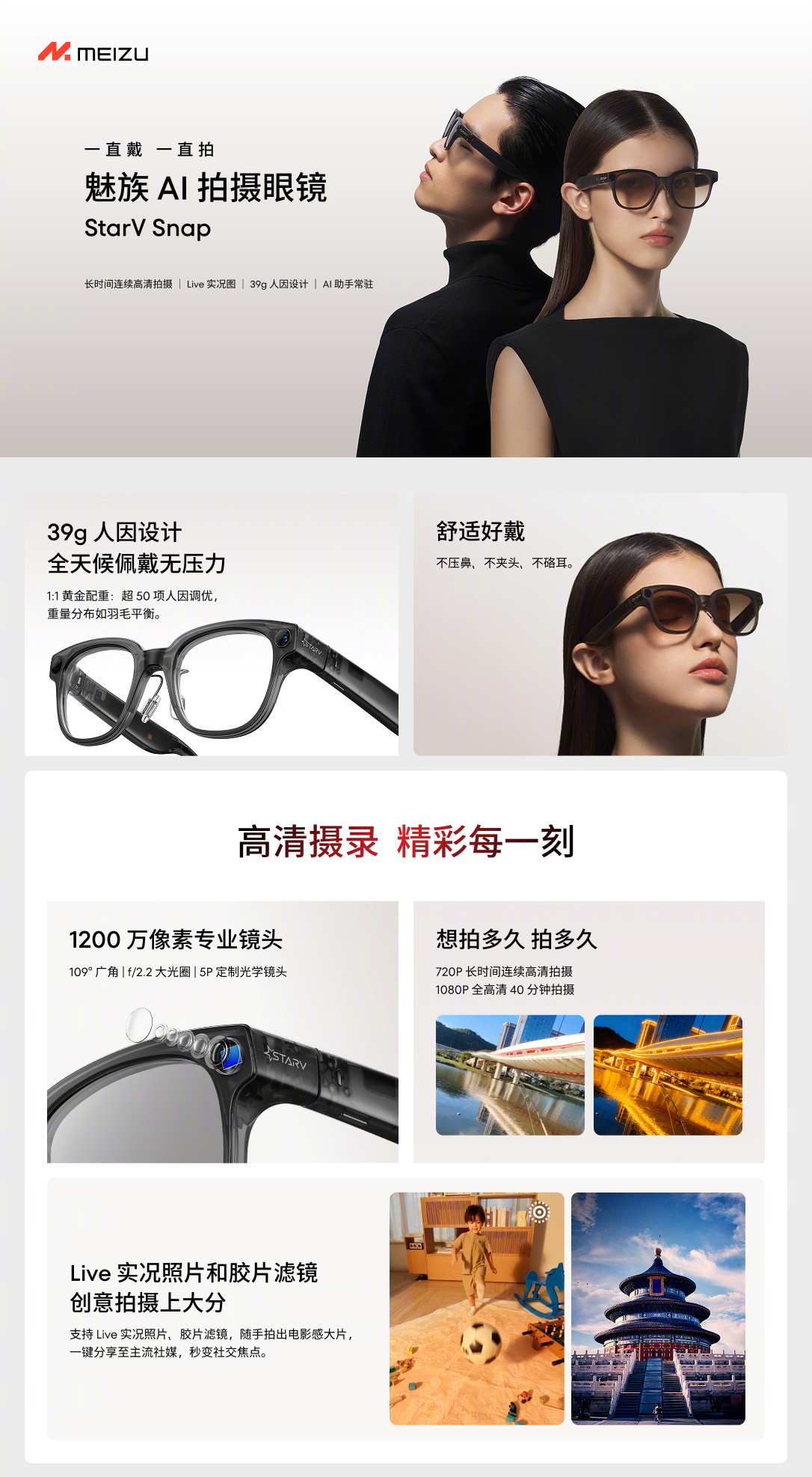 Meizu’s Snapdragon AR1 Gen 1-powered StarV Snap AI photography glasses feature a 39gm ergonomic design to offer stress-free wearing, and it has a 1:1 golden weight distribution along with 50+ ergonomic adjustments. A 12MP professional camera lens (with 109° wide-angle, f/2.2 large aperture, 5P custom optical lens) is given, supporting both 720P long-term continuous HD shooting and 1080P FHD 40 minutes shooting. Features like live photos, film filters, immersive acoustic pickup and noise reduction, multi-modal interaction and portable operation, and many AI capabilities are also there. A long lasting battery life can also be expected, and it comes with a dedicated charging box that can provide up to 9 times of charging.