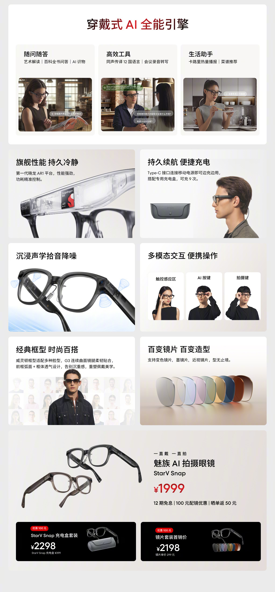 In terms of design, a classic frame that suits all face types and versatile lens options (photochromic, sunglasses, myopia lenses, endless styles) are being offered to customers. Regarding the price details, it carries a price tag of CNY 1999. Additionally, a StarV Snap Charging Case Set priced at CNY 2298 (charging case – CNY 399) and lens set with a first sale price of CNY 2198 (lens – CNY 299) are also offered. Other purchase benefits include the 12-month interest-free installments, CNY 100 off, and share order to get CNY 50 back.