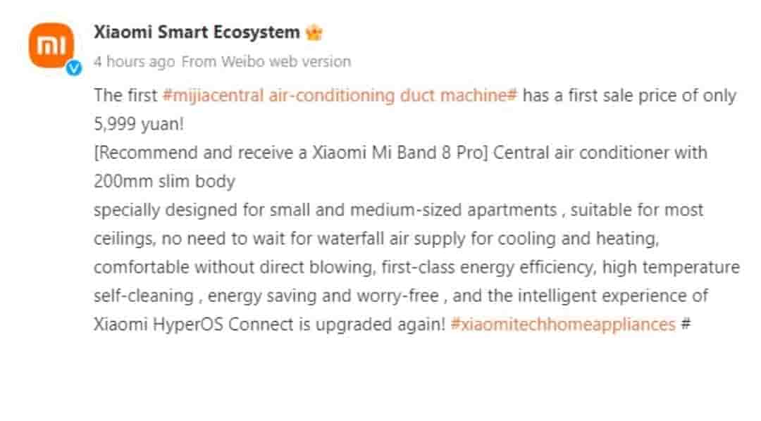 Xiaomi’s MIJIA central air-conditioning duct machine has a list price of CNY 6,999 but is currently available for CNY 5,999.