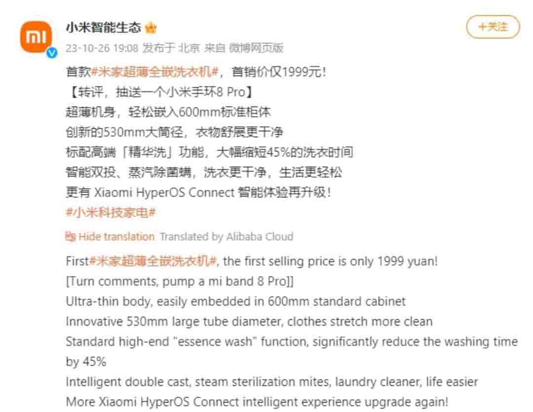Xiaomi has introduced the MIJIA ultra-thin fully embedded washing machine for a price of CNY 1,999, but it has an actual list price of CNY 2,299.