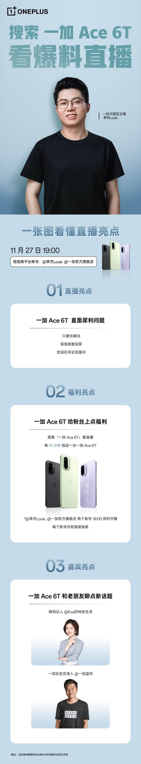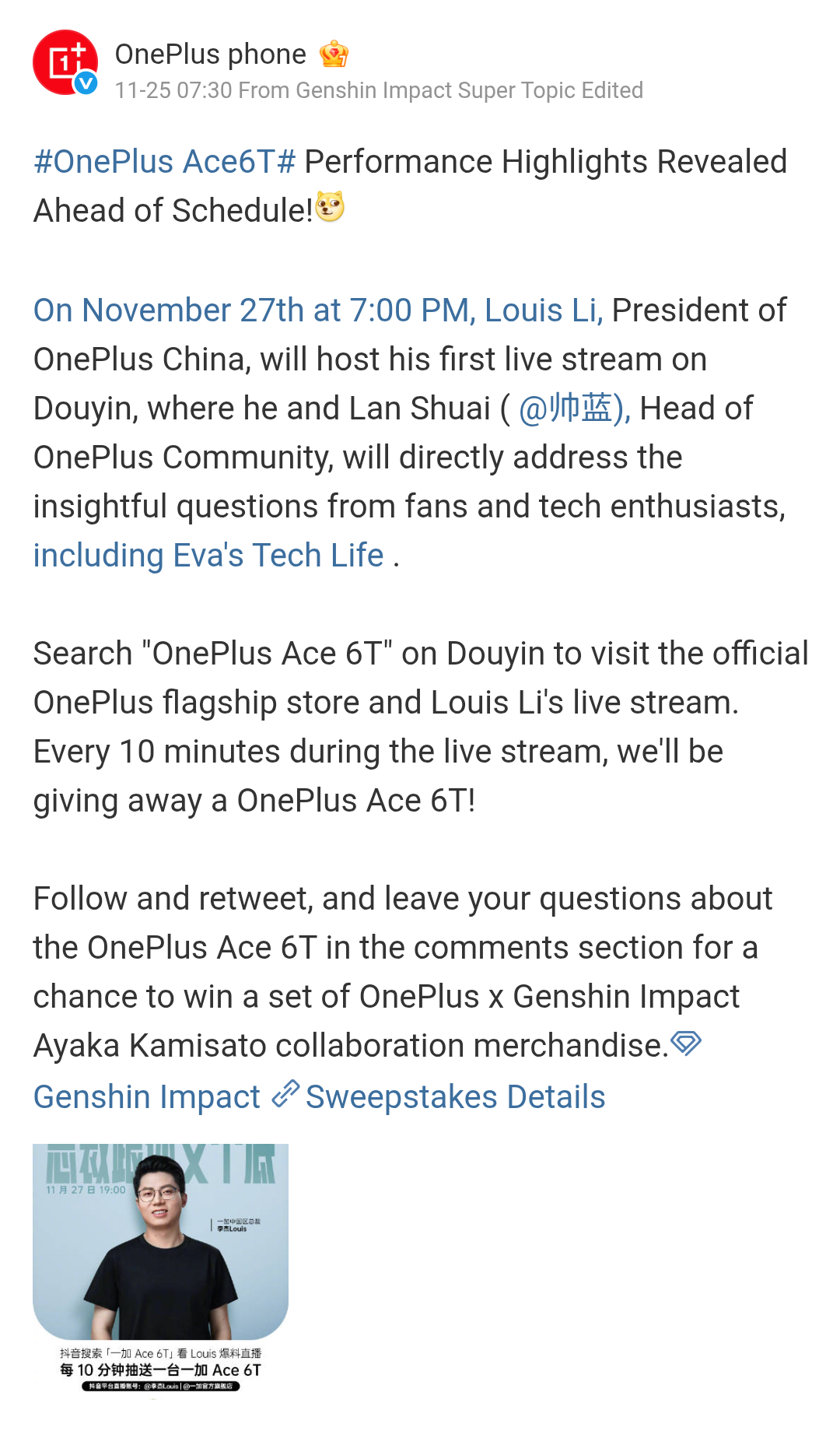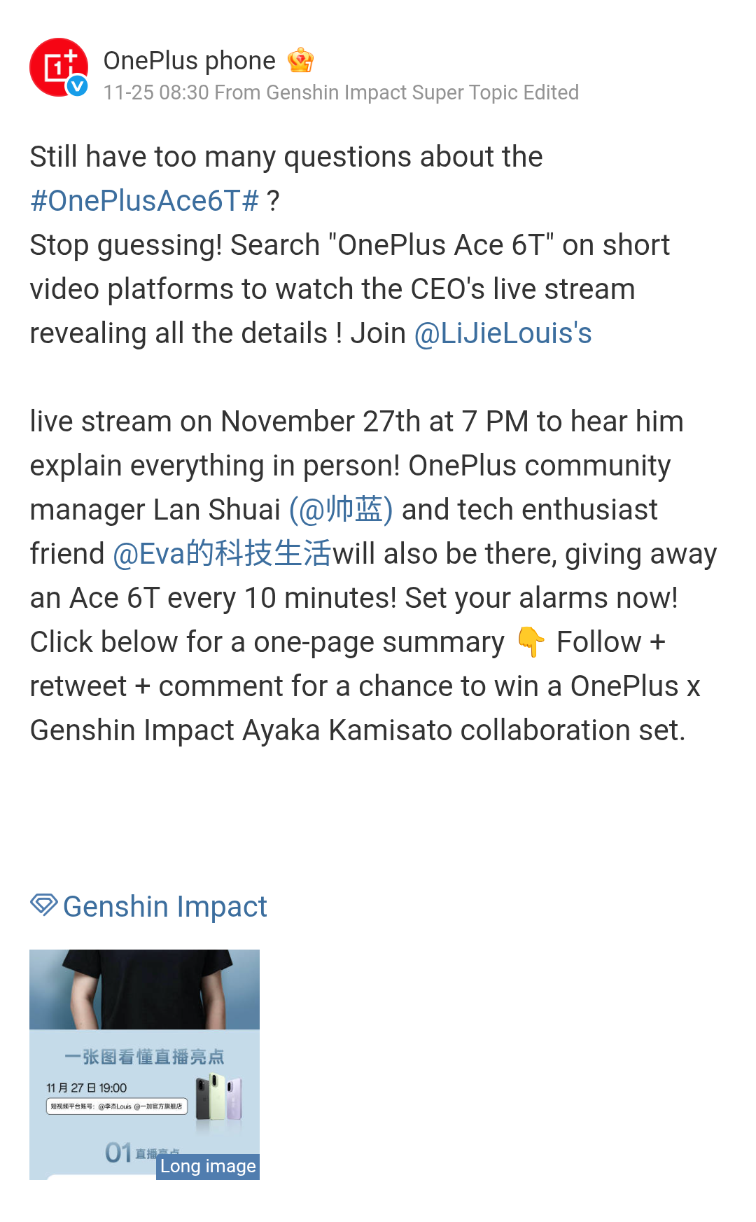 Furthermore, tomorrow on the 27th of November 2025, at 7:00 PM local time, the President of OnePlus China – Louis Li will be hosting his very first live stream on Douyin, along with the OnePlus Community Head – Lan Shuai, and both of them will be revealing the performance highlights of the OnePlus Ace 6T smartphone. Tech enthusiast – Eva’s Tech Life will also be a part of the event. The questions from the side of OnePlus fans and other tech enthusiasts will also be addressed as part of the event. For participants, OnePlus Ace 6T giveaway every ten minutes and a chance to win the OnePlus x Genshin Impact Ayaka Kamisato collaboration merchandise have also been announced.