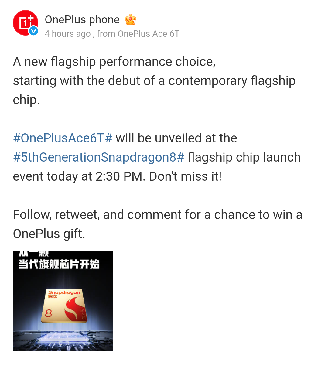 OnePlus Ace 6T Officially Confirmed to Feature the Qualcomm Snapdragon 8 Gen 5 Chip; More Performance Highlights to be Revealed Tomorrow by OnePlus China President