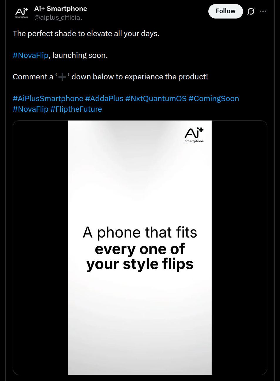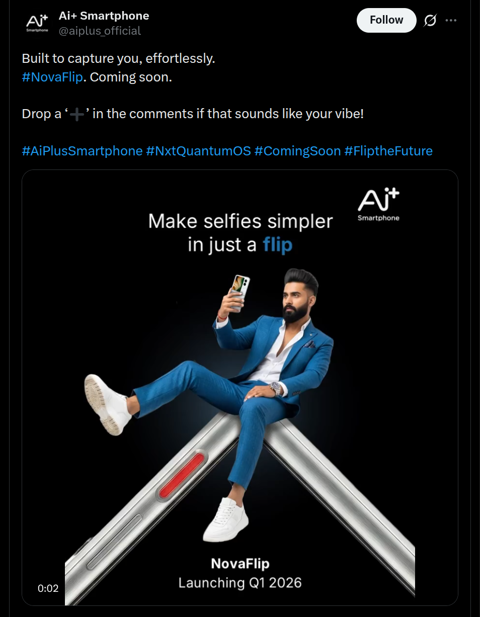 In the teaser video shared, we can spot a White color variant, and from what it seems, just like the Nova 5G and Pulse smartphone that were introduced by Ai+ previously in India, multiple color choices can be expected for the Ai+ NovaFlip as well (assuming*). In addition to the White colorway, Black, Red/Maroon, Green, Purple, and Pink color variants may be brought out. About its launch, the brand mentions it to take place in the first quarter of 2026 (Q1 2026).