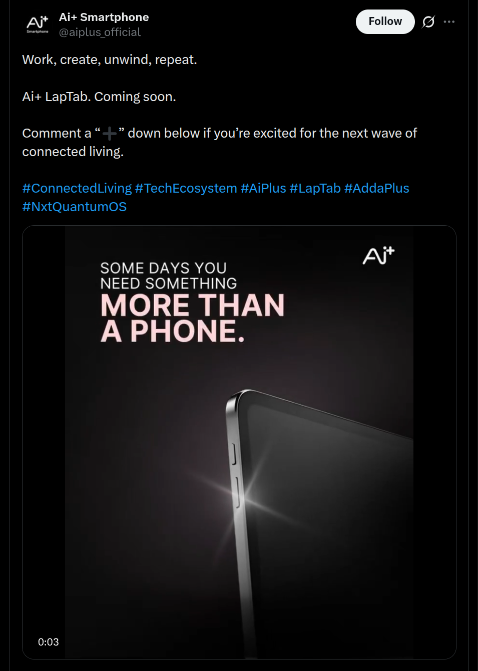 Also, the launch of the Ai+ LapTab has again been teased, and it is going to be a tablet device with an attachable keyboard. Notably, this device was officially teased late last month in November 2025, and was said to arrive in Q1 2026 for Indian customers. Along with an attachable keyboard, stylus support has also been revealed for it. Reportedly, 11″, 12″, and 13″ display variants may also be offered. This device is also suggested to be something which will meet all the needs of its users.