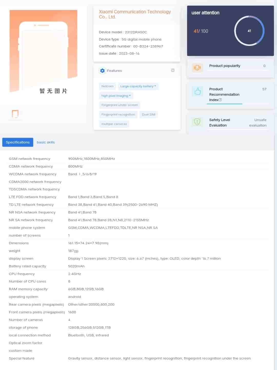 The alleged Redmi Note 13 Pro Plus 5G with a similar model number of 2312DRA50C has also appeared on the TENAA database.