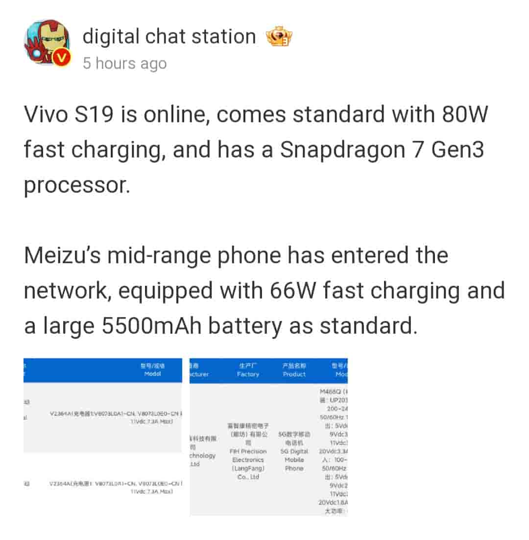 Apart from Vivo S19, the tipster has also shared the 3C listing of a Meizu smartphone with model number M468Q.