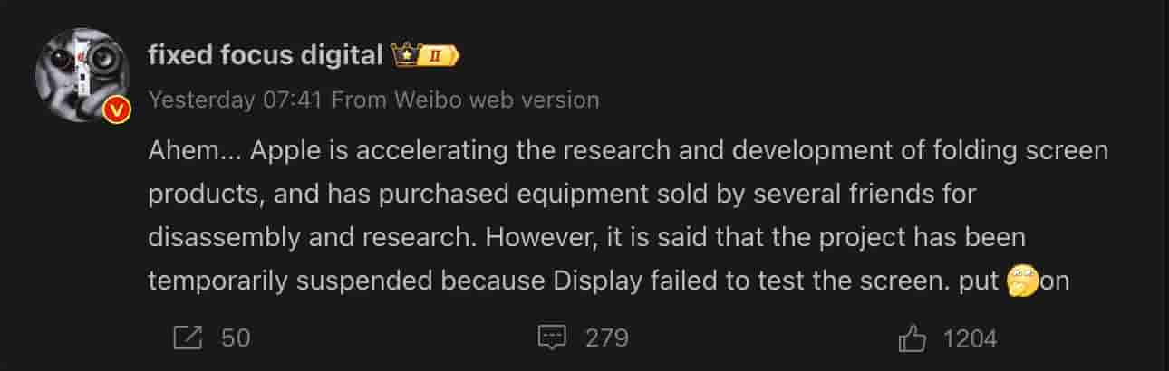 As per the user Apple purchased several foldable smartphones from different brands for dismantling. This was reportedly done for the research and development by the company. Tipster further added in a post that the project has now been stopped due to unsatisfactory results from the screen test.
