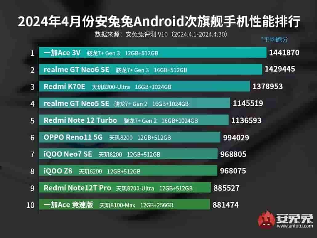 OnePlus Ace 3V with Snapdragon 7+ Gen 3 SoC has topped the sub-flagship smartphone performance list for two consecutive months. The device scored 1441870 points in April 2024. Realme GT Neo 6 SE with Snapdragon 7+ Gen 3 SoC is in second position with a 1429445 score. The third position is secured by the Redmi K70E powered by a Dimensity 8300 Ultra processor with a 1378953 score. Realme GT Neo 5 SE and Redmi Note 12 Turbo smartphones secured fourth and fifth position. Whereas Dimensity 8200 chipset-powered smartphones Oppo Reno 11 5G, iQOO Neo 7 SE and iQOO Z8 held 6th, 7th, and 8th position respectively. While the Redmi Note 12T Pro with Dimensity 8200 Ultra holds the 9th rank in the list and OnePlus Ace Racing Edition with Dimensity 8100 Max secured the 10th spot with an 881474 score.