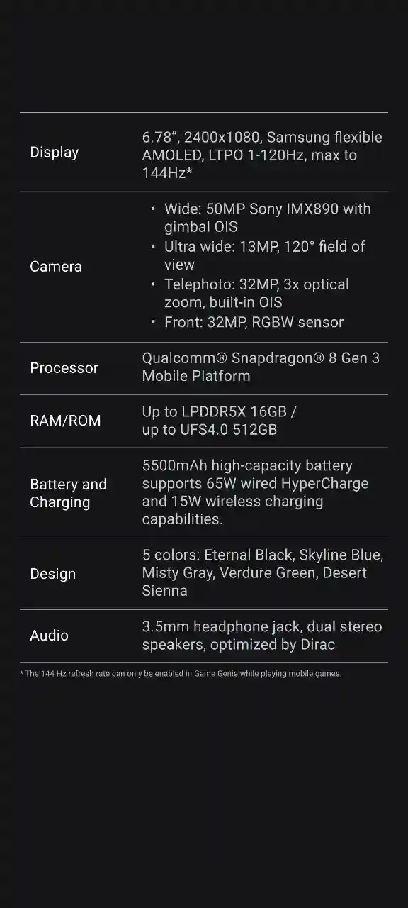 About its specs, the Zenfone 11 Ultra is revealed to have the Qualcomm Snapdragon 8 Gen 3 chipset onboard, with up to 16GB LPDDR5X RAM and up to 512GB UFS4.0 internal storage. It is going to have a 6.78″ Samsung Flexible AMOLED display with a 2400 x 1080 pixels resolution, LTPO 1-120Hz support, and a maximum refresh rate of 144Hz. The rear camera unit will consist of a 50MP Sony IMX890 main camera with gimbal OIS, a 13MP ultrawide camera with 120° field of view, and a 32MP telephoto camera with 3x optical zoom and built-in OIS, whereas for selfies there is a 32MP front camera with RGBW sensor. A 5500 mAh battery with 65W wired HyperCharge and 15W wireless charging features are also part of the device. Other specs include a 3.5mm audio jack and a Dirac-optimized dual stereo speaker.