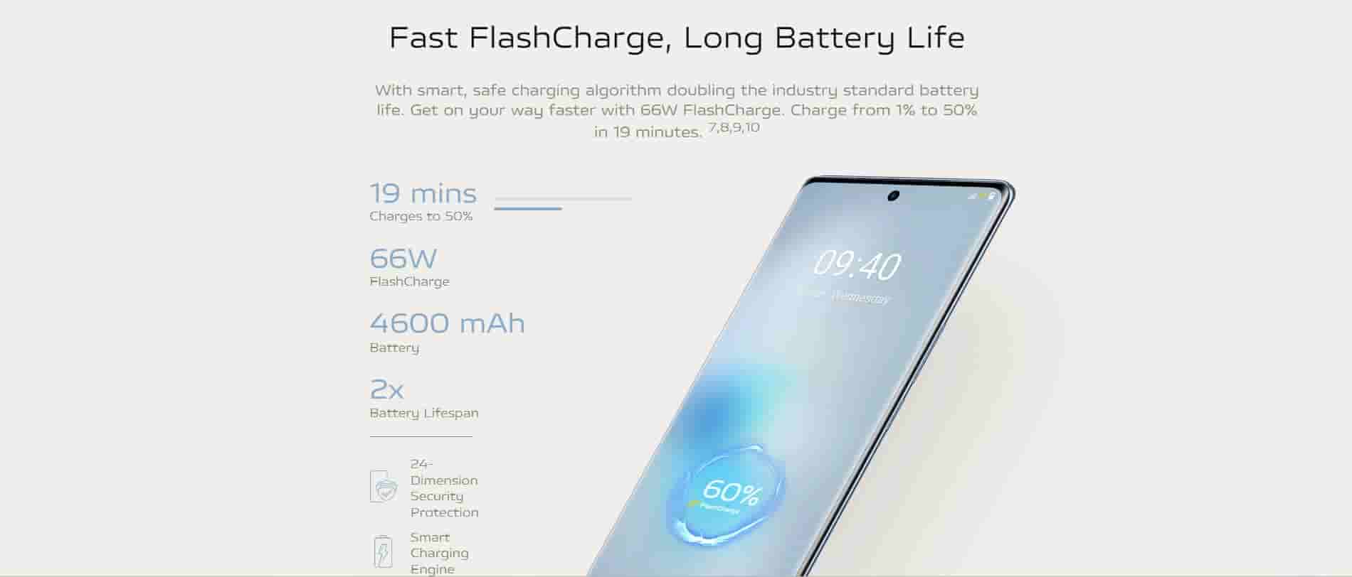 According to the company, this smartphone can be charged from 1% to 50% in just 19 minutes, thanks to its 66W FlashCharge and 4600 mAh battery. The company also claims to have increased the battery lifespan by up to 2 times, offering better durability and longevity for the battery.