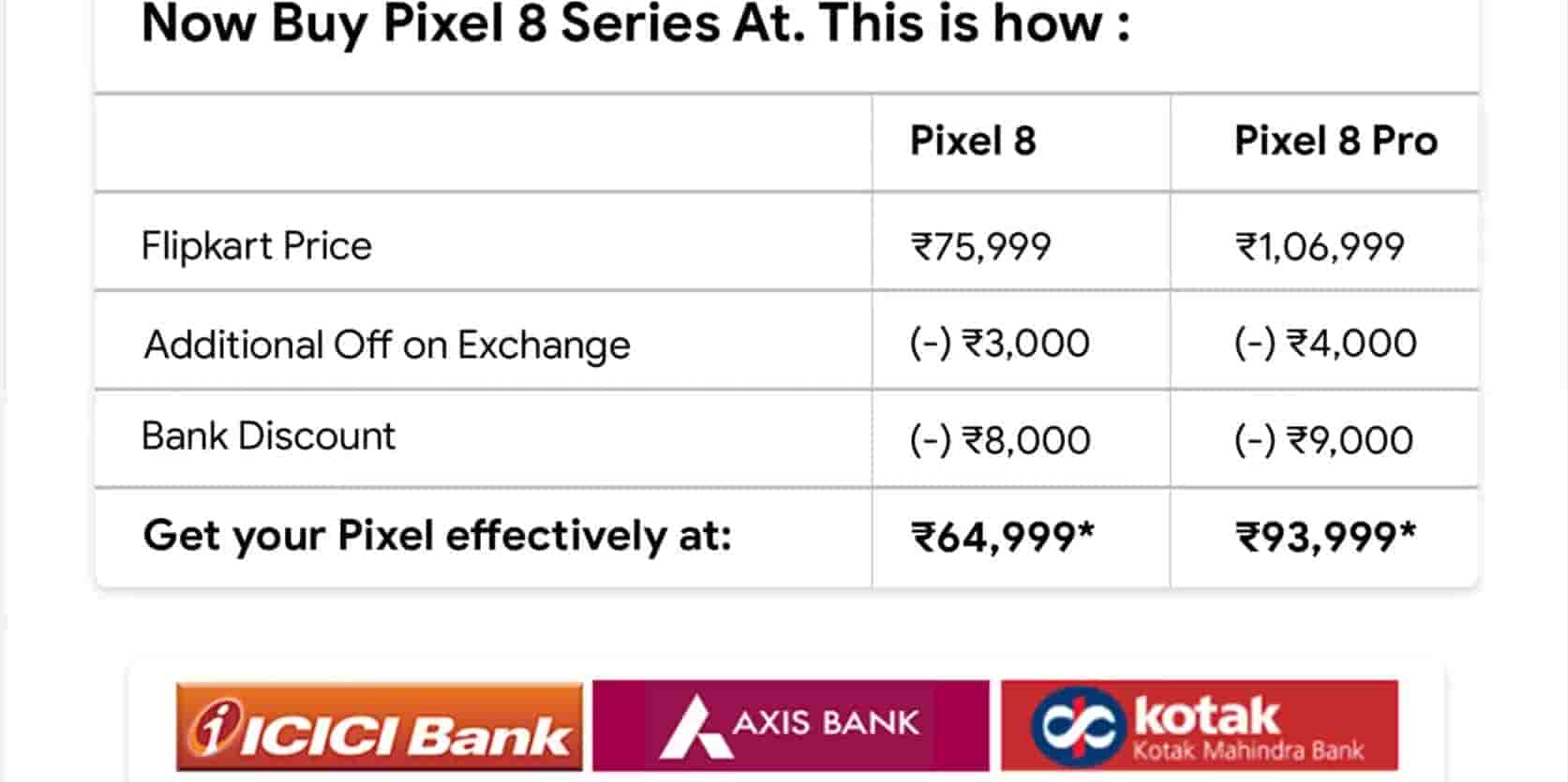 Both of the smartphones are also listed on Flipkart for pre-booking with some additional discounts and offers. You can avail of additional off on exchange up to Rs 3,000 on Pixel 8 and Rs 4,000 on Pixel 8 Pro. Buyers can also get bank discounts up to Rs 8,000 on Pixel 8 and Rs 9,000 on Pixel 8 Pro bringing its final price down to Rs 64,999 for Pixel 8 and Rs 93,999 for Pixel 8 Pro smartphone.