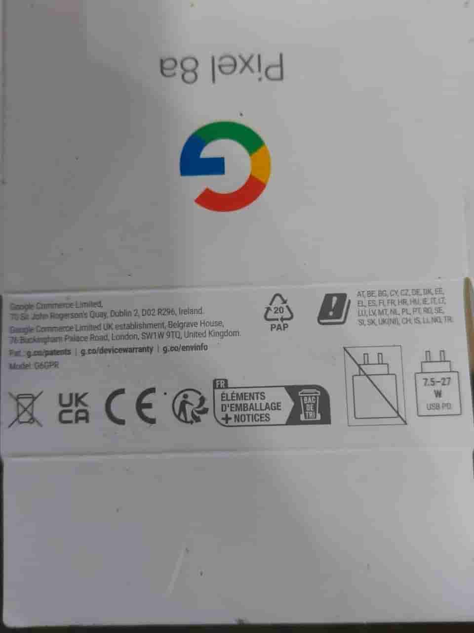 The above image confirms that the smartphone will be made available in a Black color variant. The box also shows a recommendation to use a charging unit with a maximum power of 27W which is equivalent to the specs of Pixel 8 smartphone. The model number for the device is G6GPR.