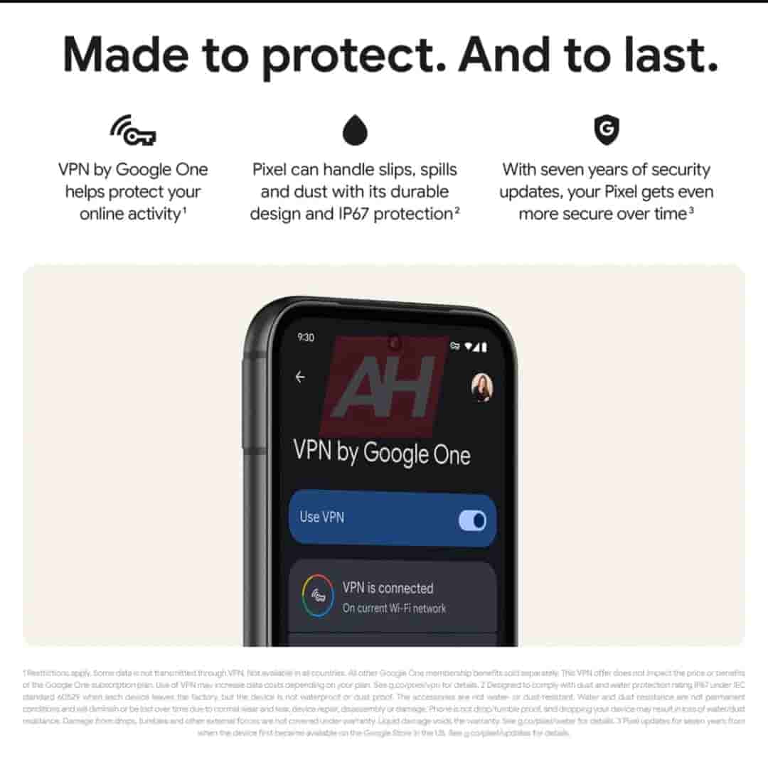 The device is said to arrive with Google One VPN, an IP67 rating and it will also be getting 7 years of Security updates. Other than this the above image also revealed that the smartphone will arrive with a Google Tensor G3 processor, and fast charging capability while the other features that are said to be included in the device are- Screening calls with Call Assist, Summary of Emails, and Night Sight. Just like the promo video, the marketing material also reveals that the device will be arriving with features like Best Take, Circle to Search, and Best Take.