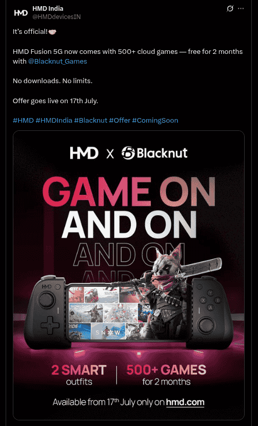 As mentioned, HMD’s Fusion 5G smartphone will now be offered to its Indian customers with 2 months of free cloud gaming feature with Blacknut Games, and its users will be able to access over 500 game titles at no added cost. This is in addition to the 3 outfits (HMD Gaming Outfit, HMD Flashy Outfit – in Indigo, and HMD Casual Outfit) that are already available with the device. The offer is currently live from today on the 17th of July 2025, and interested Indian customers can purchase the device via the brand’s official India website.