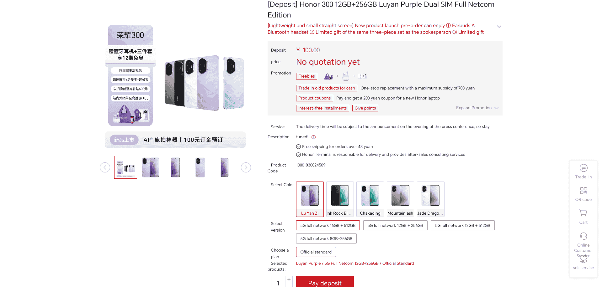 Coming to the official website listings, the Honor 300 will be offered in four storage options(8GB/256GB, 12GB/256GB, 12GB/512GB, & 16GB/512GB) and five color choices(Purple, Black, Light Green/Blue, Grey, & White), while the 300 Pro model will only have three storage options(12GB/256GB, 12GB/512GB, & 16GB/512GB) and three color choices(Black, Light Green/Blue, White).