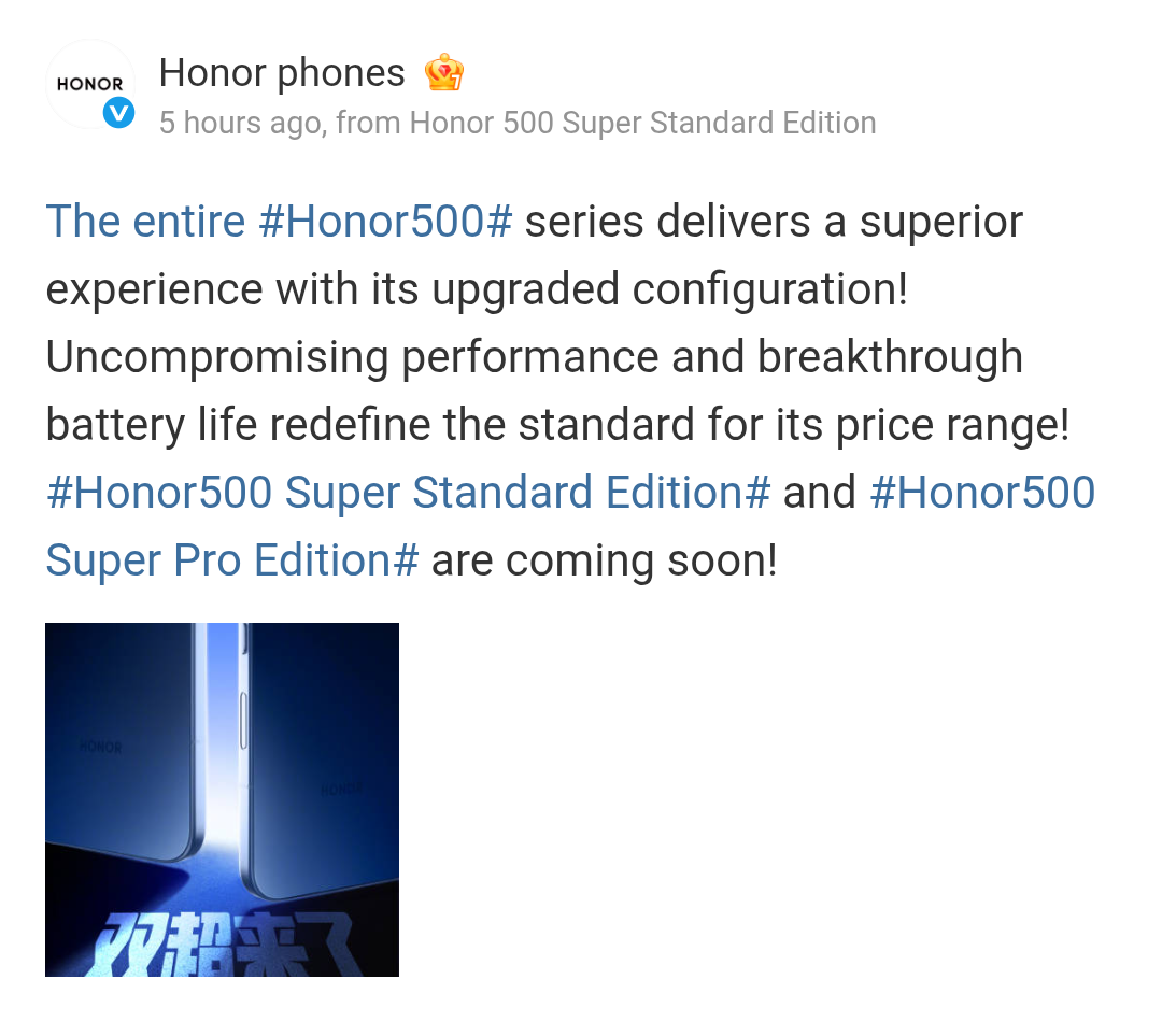As per the Weibo updates shared by Honor, the Honor 500 series which will consist of the standard Honor 500 and the Honor 500 Pro smartphone models will be coming soon in the Chinese market, and these latest devices are revealed to offer upgraded configurations. Furthermore, ‘uncompromising performance’ and ‘breakthrough battery life’ are projected as two key aspects of the upcoming smartphones, and these are claimed to redefine the standard of the segment (price-range).